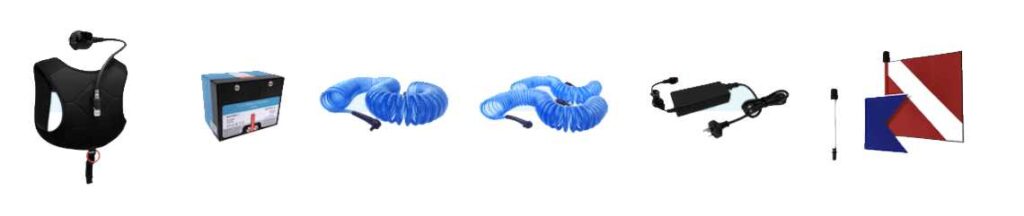 Ajoutez une batterie de rechange pour enchaîner plusieurs plongées, ou d’autres accessoires comme un harnais supplémentaire, un chargeur bateau 12V DC, un drapeau ou un sachet de pièces de rechange.